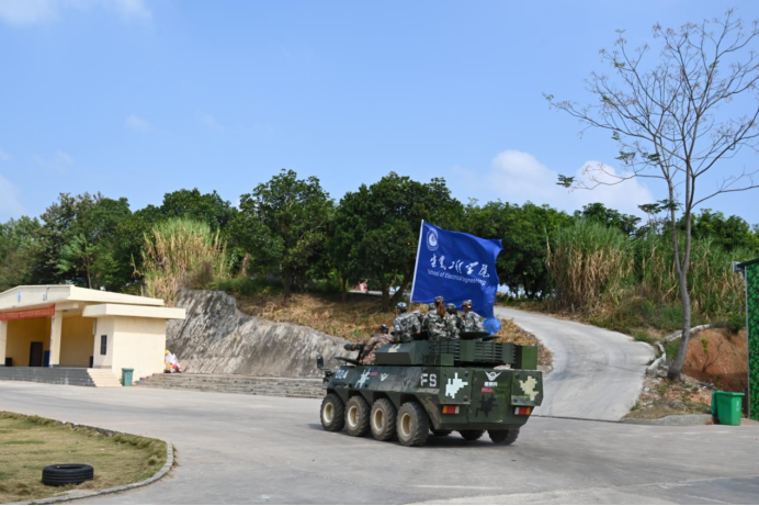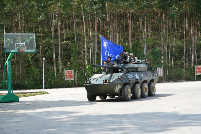 两个团建项目结束后,随即而来的便是装甲车行军体验。蓝盔国防教育实践基地上,浓烟滚滚,铁甲轰鸣,前进、急转、上坡,战车裹挟着飞溅的泥土,刺激着每一位同学的神经感官,让同学们切实感受到了装甲作战的惊心动魄。