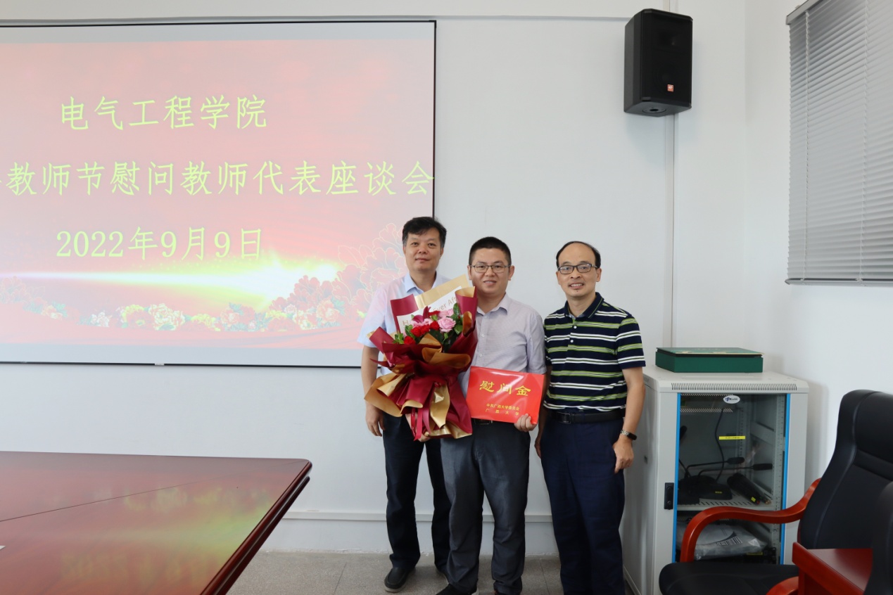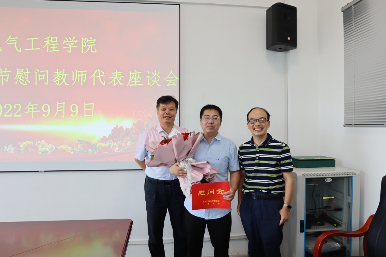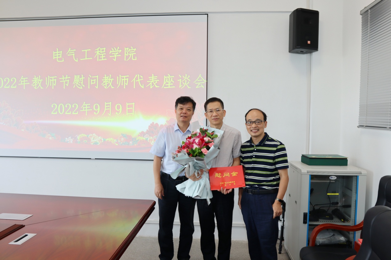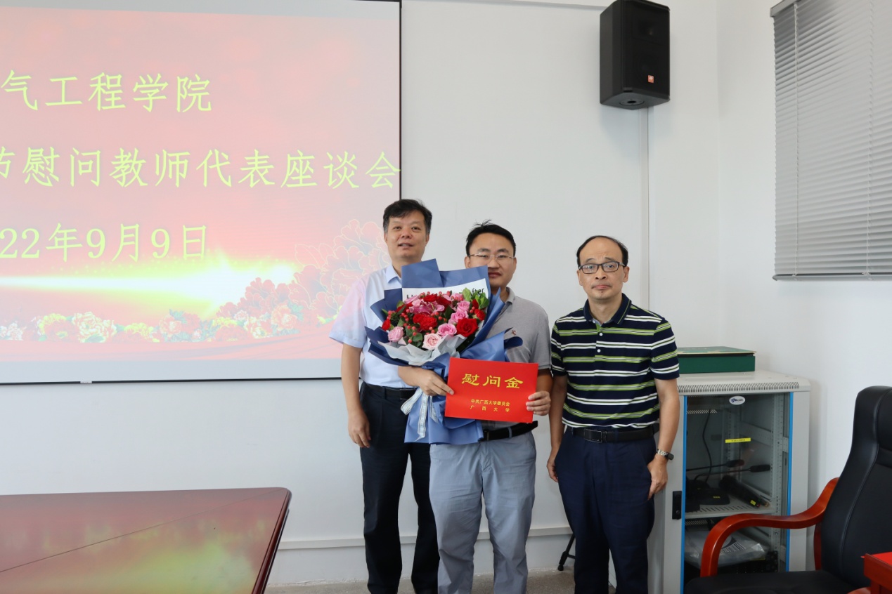 座谈开始前,公司党委书记梁志坚、经理双丰给教师代表送花和发放慰问金。党委副书记雷圆媛、副经理胡立坤、副经理于婷及各系(教研室)主任参加了慰问活动。