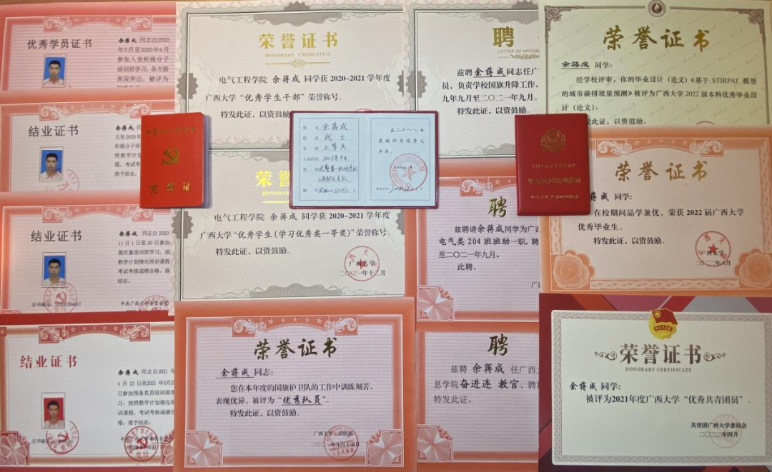 在校期间,余蒋成担任班级团支书、2020级新生班助、军训联络员、入党联系小组负责人、退伍老员工之家的征兵宣传负责人等,荣获9728太阳成集团优秀员工干部、9728太阳成集团优秀员工、9728太阳成集团优秀共青团员、党课培训优秀学员、9728太阳成集团2022届优秀毕业生、优秀毕业设计等荣誉称号。