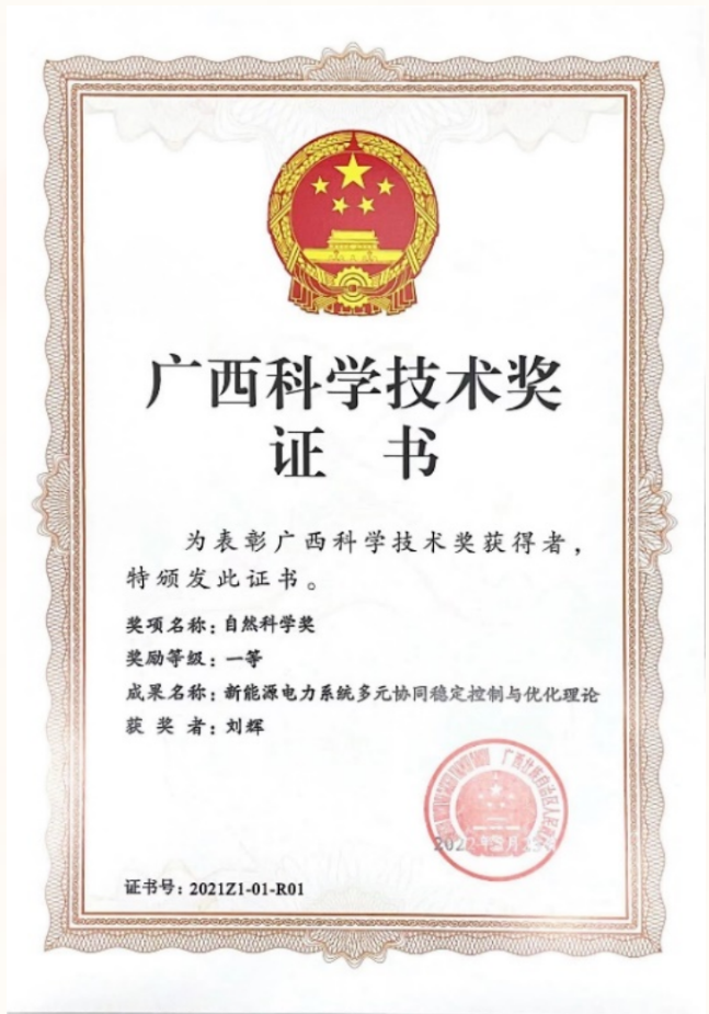 近日,广西壮族自治区人民政府公布2021年度广西科学技术奖奖励名录, 公司刘辉教授牵头、以9728太阳成集团为第一单位完成的《新能源电力系统多元协同稳定控制与优化理论》项目,荣获广西自然科学一等奖。