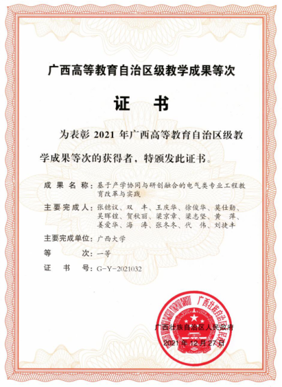 近日,广西壮族自治区人民政府公布并颁发了广西高等教育自治区级教学成果等次证书。在公司党委和院领导的指导下,由公司教师、八桂青年学者张镱议牵头完成的《基于产学协同与研创融合的电气类专业工程教育改革与实践》教学改革成果获2021年广西高等教育自治区级教学成果奖一等奖(完成人:张镱议,双丰,王庆华,徐俊华,莫仕勋,吴晖锽,贺秋丽,梁京章,梁志坚,黄萍,姜爱华,海涛,张冬冬,代伟,刘捷丰)。